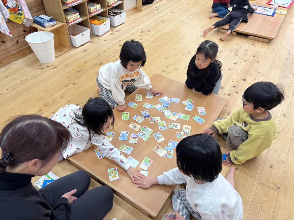 8日に、独楽回し、羽根つき、かるたとり、福笑いなどの遊びをしました。
